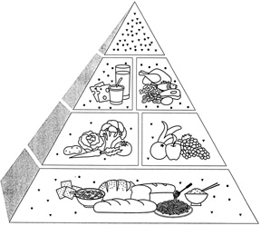 Let us consider the relative amounts of each “food group” suggested by the food pyramid: